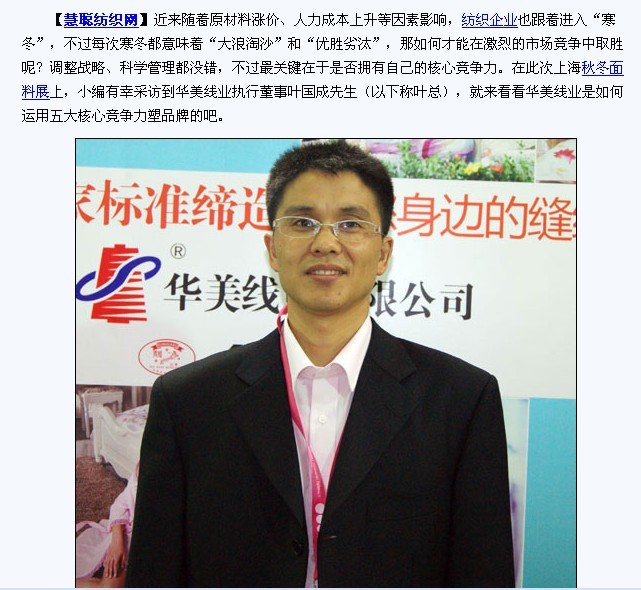 慧聰紡織網(wǎng)于11月8日刊發(fā)新聞《華美線業(yè)葉國成:五大核心競爭力塑品牌(圖)》