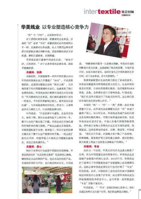 而在另一個層面,華美又在同步為這盤大棋擺子布局,作為中國服裝協(xié)會的理事單位,華美線業(yè)也是服裝產(chǎn)業(yè)聯(lián)盟中的核心會員,2012年7月,華美線業(yè)在寧波舉行了中國服裝協(xié)會產(chǎn)業(yè)聯(lián)盟核心會員授牌儀式。這標志著華美線業(yè)率先在行業(yè)內打響了“專業(yè)”的攻堅戰(zhàn)。此外,中國紡織工業(yè)協(xié)會的首家中國縫紉線技術研發(fā)中心會落戶在華美,標志著華美線業(yè)成為*********縫線技術研發(fā)中心,這與華美一直所塑造的“專業(yè)”形象不謀而合。