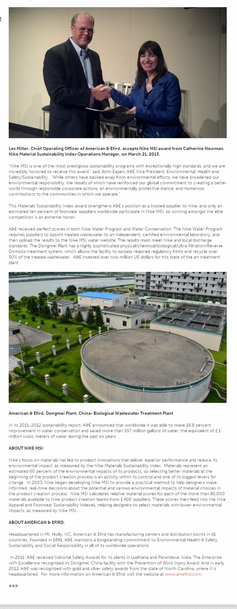 作為華美線業(yè)的美方母公司—A&E線業(yè),榮獲耐克可持續(xù)材料獎((Materials Sustainability Index),這無疑是A&E線業(yè)多年來致力于可持續(xù)發(fā)展的最新力證,更是華美線業(yè)致力于環(huán)保的國際化淵源。