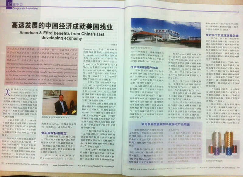 近日,《CTA紡織及成衣》6月刊發(fā)《高速發(fā)展的中國經(jīng)濟(jì)成就美國線業(yè)》一文。文中采訪了A&E亞太區(qū)副總裁卓漢堅(jiān)先生。