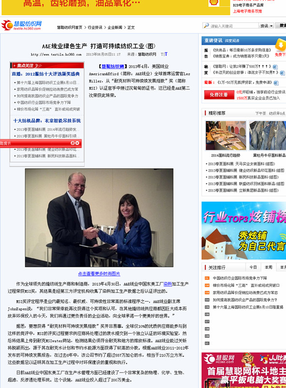 近日,《慧聰紡織網(wǎng)》刊文關(guān)注A&E線(xiàn)業(yè)。